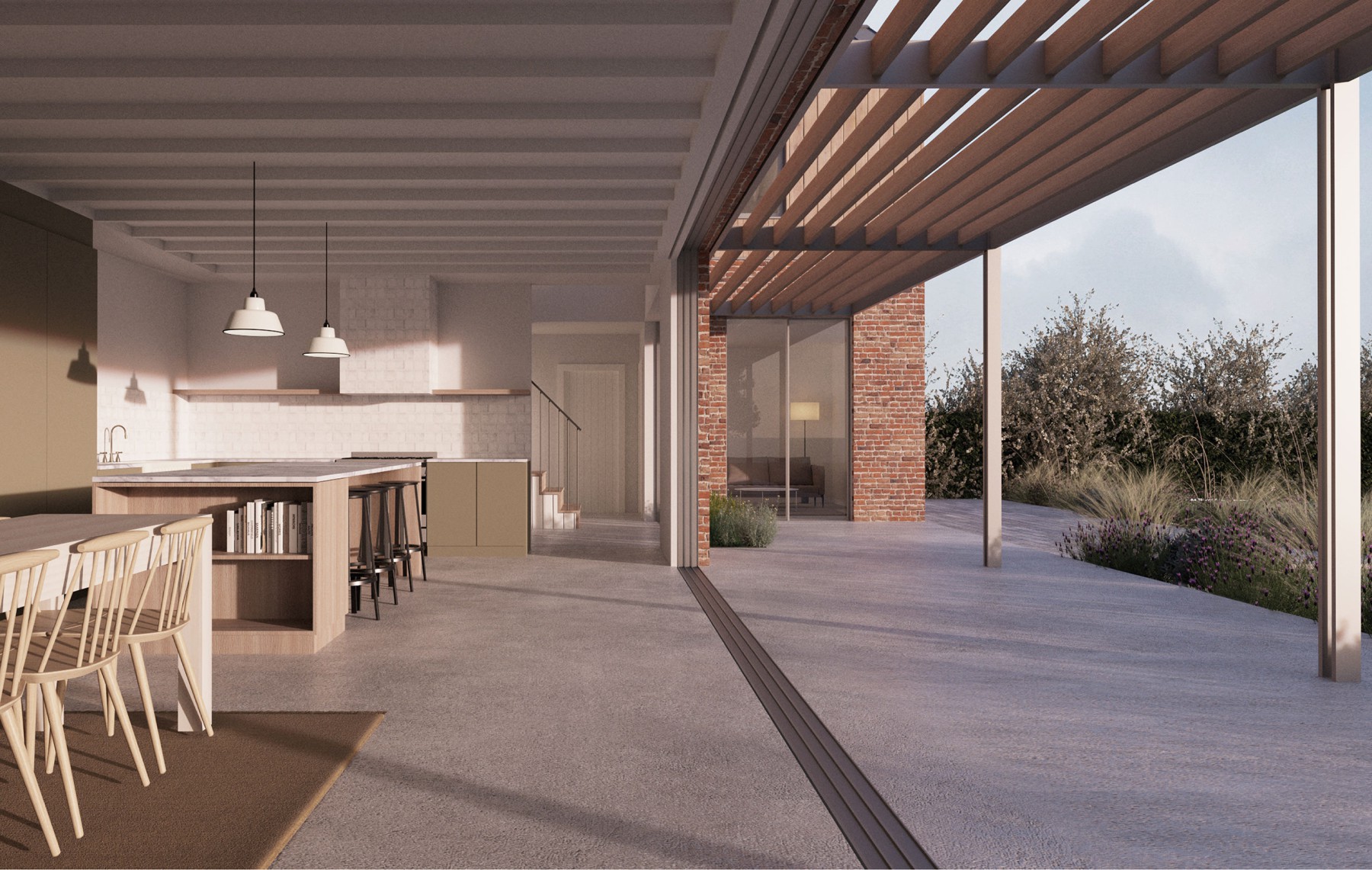 Hawthorn House is a one-off new build house for a gap field site in a rural Buckinghamshire village. The main living spaces enjoy unobstructed views across the Vale of Aylesbury with extensive glazing and solar shading via a bespoke pergola structure above. The sustainable design incorporates environmental technologies including MVHR, Air Source heat pumps, photovoltaics, and battery storage.